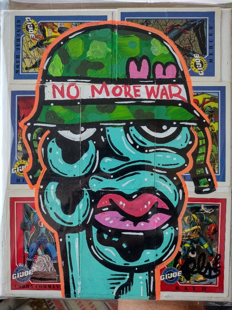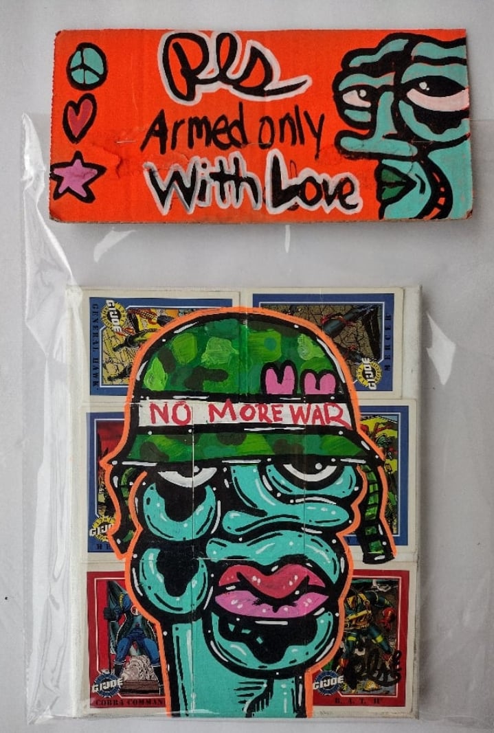 A soldier, armed only with love, stairs at the viewer with an important message written on his helmet.